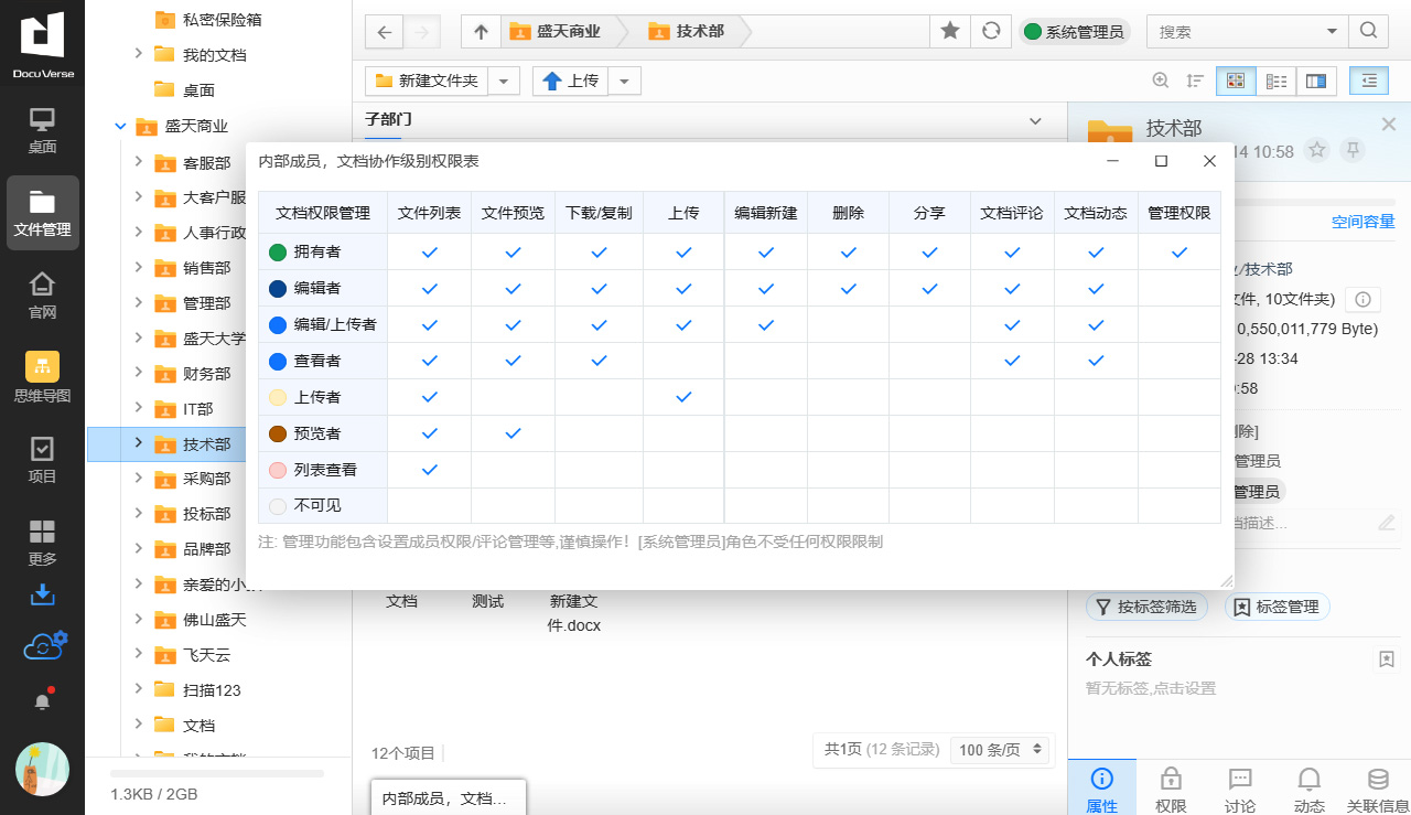 DocuVerse Cloud Office provides extremely detailed setting options in terms of rights control, covering more than 30 different rights configuration items such as file management, upload and download, data configuration, user management, group management, and plug-in management. In addition, it also supports setting multiple permission groups, which can be combined with various group role permissions, covering almost all business scenarios in the enterprise.