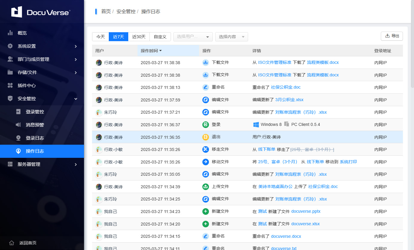 DocuVerse cloud office has login logs and operation logs in the backend, which can be traced back to and accountable at any time. There is also a dynamic watermark of documents to ensure document security and prevent leakage.