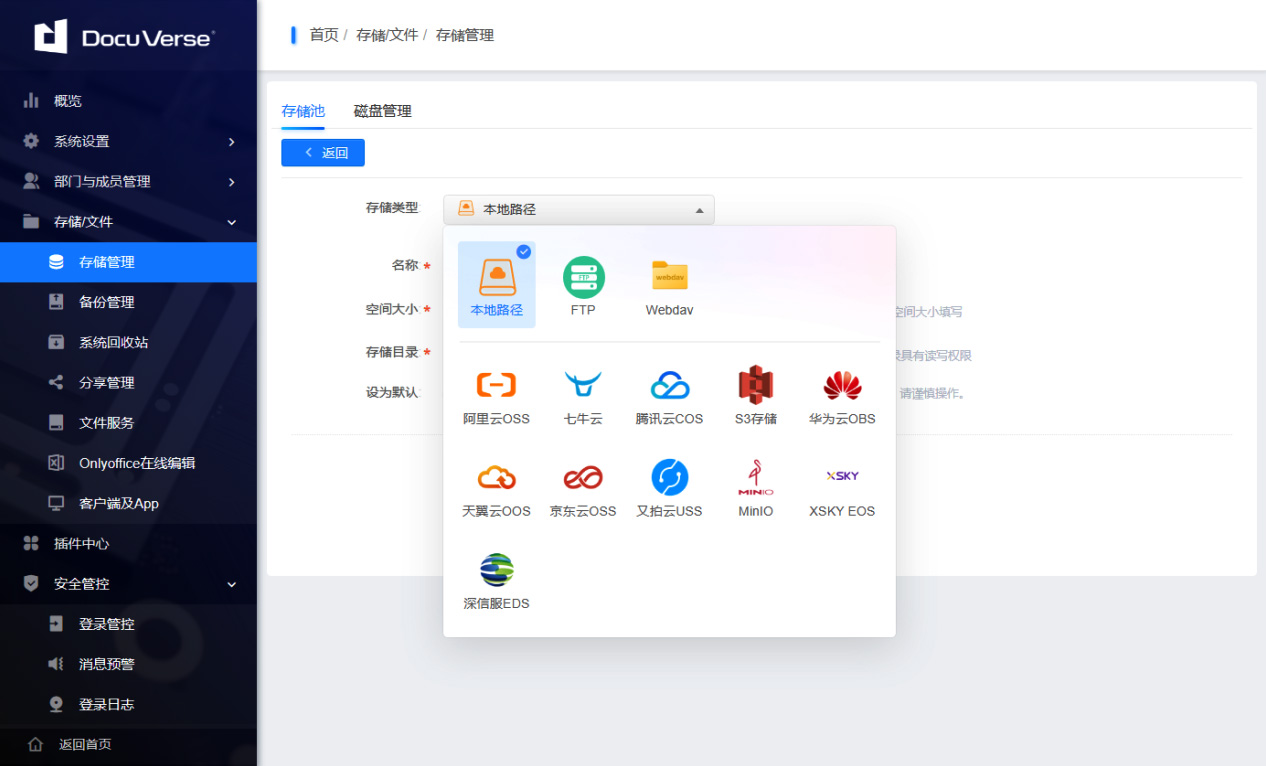 DocuVerse Cloud Office supports multiple storage methods such as multi-cloud converged storage, local server storage, FTP storage, and object storage, and supports data storage to Alibaba Cloud OSS, Qiniuyun, Tianyi Cloud, S3 (and standard) object storage.