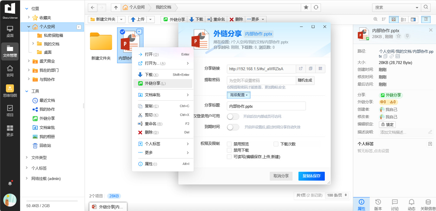 External link sharing can set permissions, preview only, no download, etc., flexible and changeable
